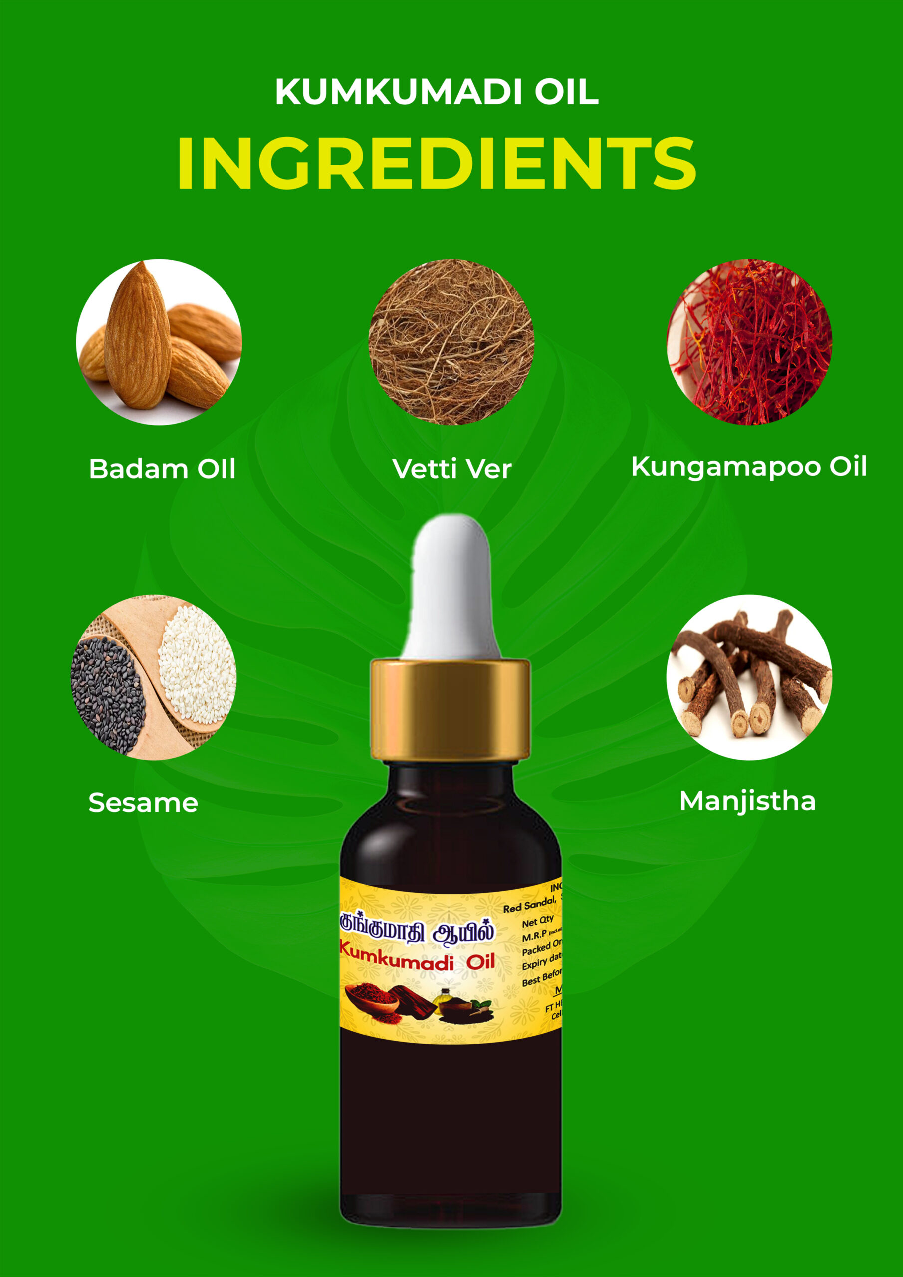 Badam oil, Vetti ver, Sesame, Manjistha.